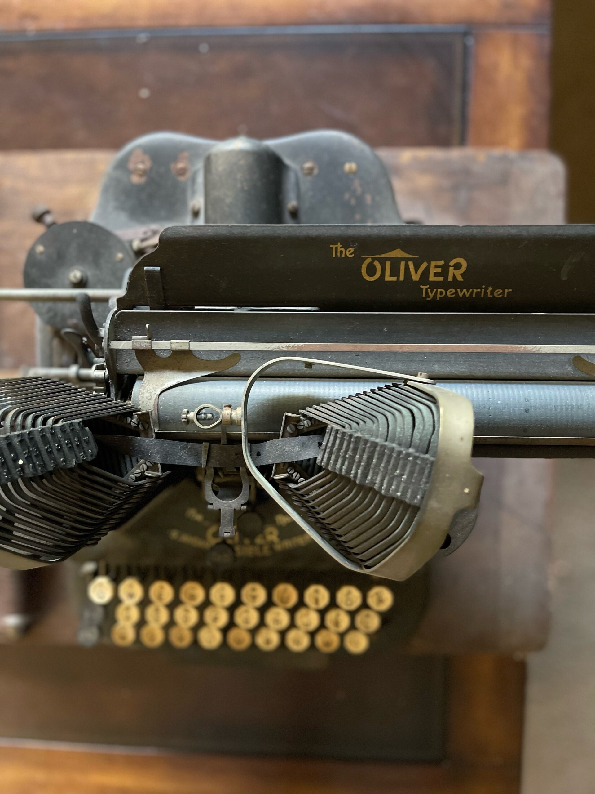 The Oliver typewriter is one of my favorite machines: Invented by Thomas Oliver, who was born in 1852, the machine has a “down strike” design with type slugs that move from above instead of below, which is where the “batwing” nickname comes from.